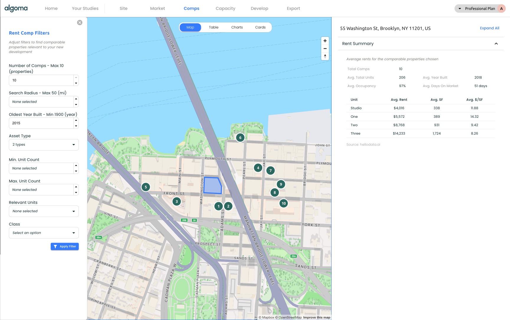 Filter by proximity, recency, asset type, asset size, unit types, and building class to hone your comp set and envision your competitive landscape with comp-specific rent charts.